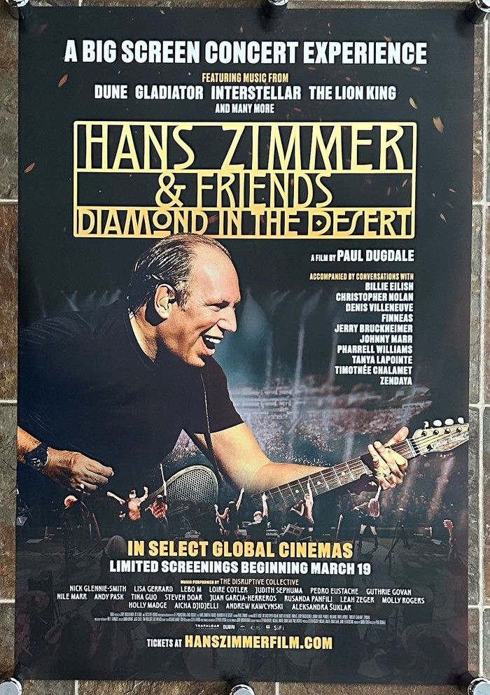 Here is an original rare movie poster from the 2025 musical concert film - "HANS ZIMMER AND FRIENDS: DIAMOND IN THE DESERT" - starring Hans Zimmer, Billie Eilish, Christopher Nolan, Pharrell Williams, Timothée Chalamet and Zendaya. The movie is a concert film and documentary of Hans Zimmer filmed primarily during a 2024 tour stop in Dubai's Coca-Cola Arena. This poster that I am selling is a hard-to-find original 1-Sheet that measures approx. 27 x 40 inches in size. It is rolled and in near mint condition. It is 1-sided and has been stored in a dry, smoke-free home. NOT A CHEAP REPRINT BUT A BEAUTIFUL ORIGINAL THEATRICAL RELEASE POSTER. Great item for HANS ZIMMER fans and collectors! |