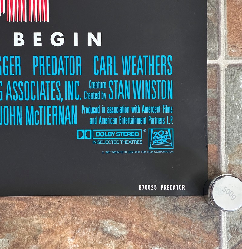 This is the US Regular Style poster. It is an original 1-Sheet and it measures approx. 27 x 40 inches in size. The poster is rolled and in Near Mint condition. It is 1-Sided and has been stored in a dry, smoke-free home. It has the NSS Number of 870025 in the lower right corner. Great item for ARNOLD SCHWARZENEGGER and/or "PREDATOR" fans and collectors!