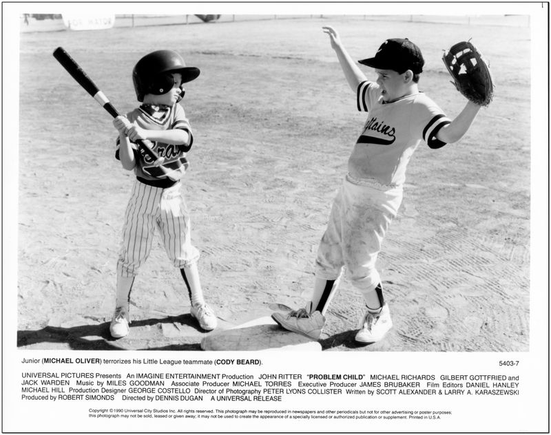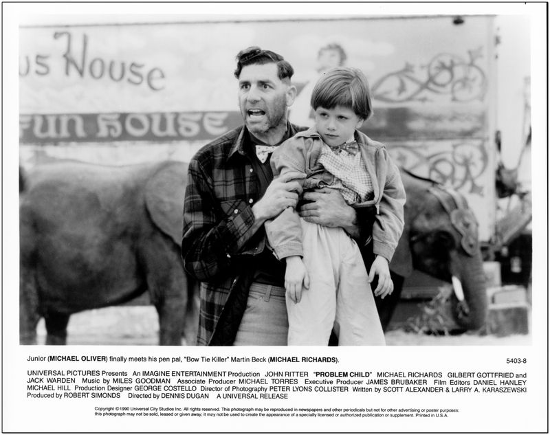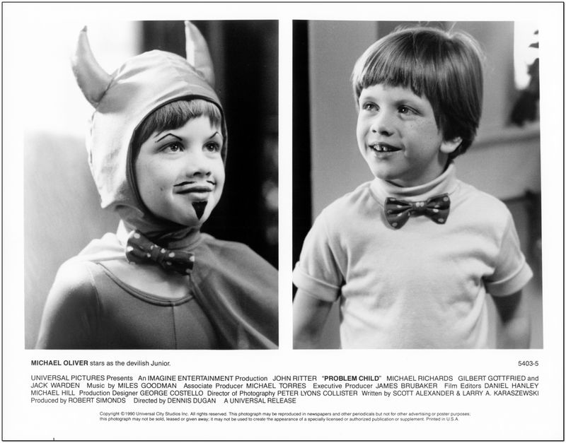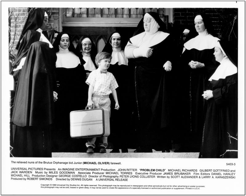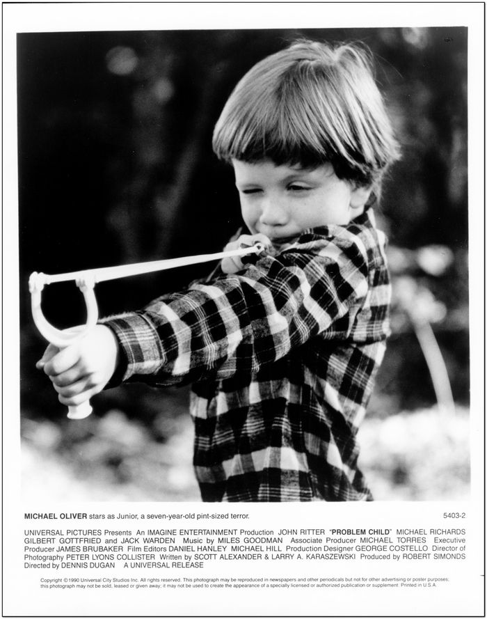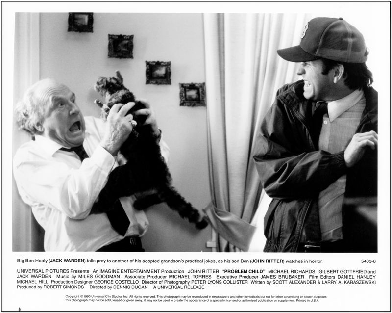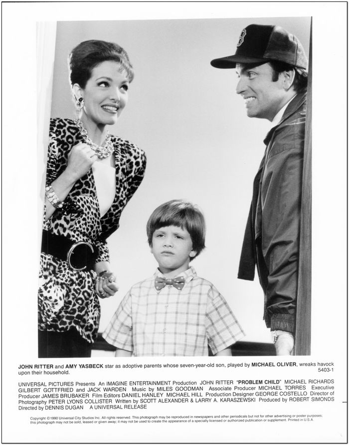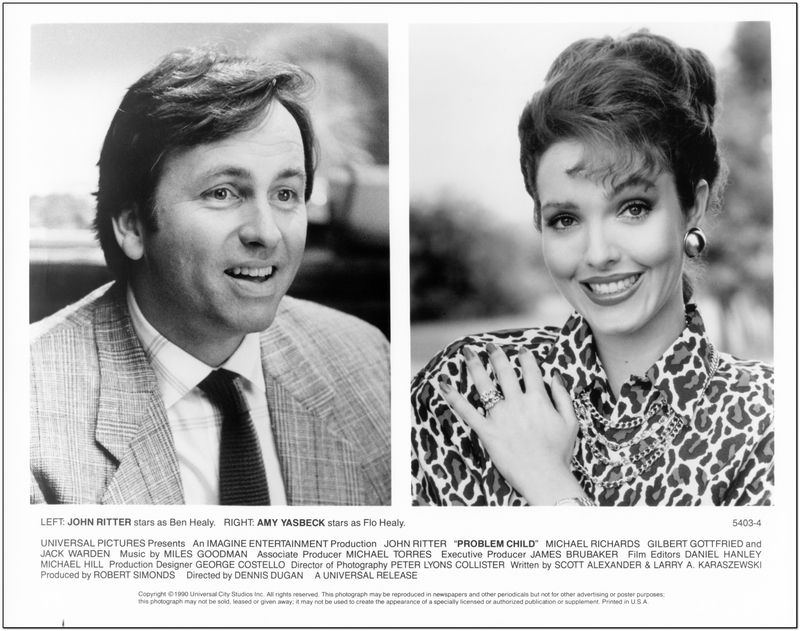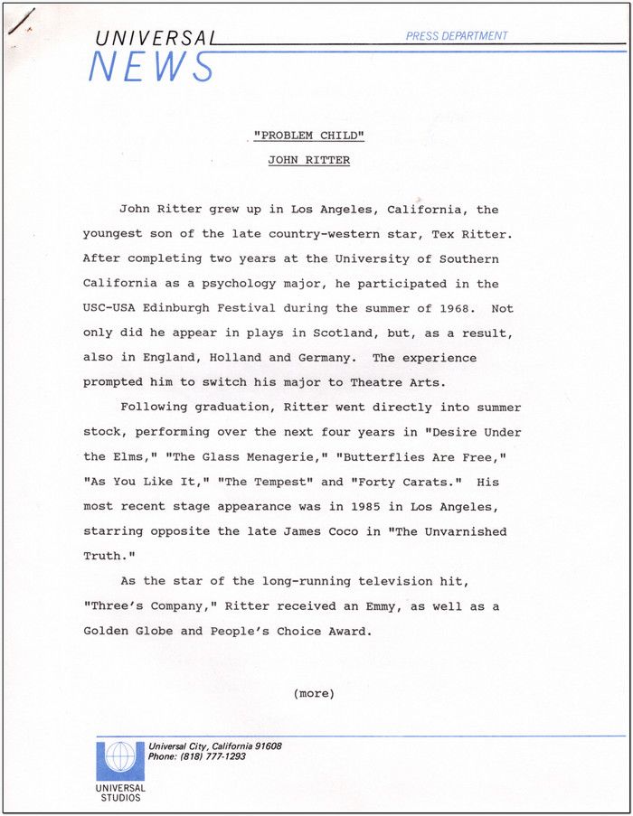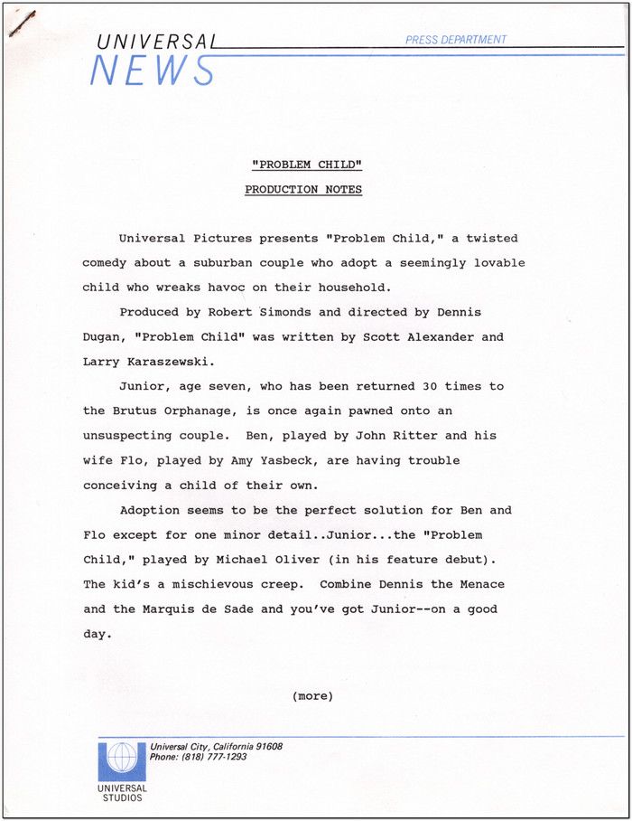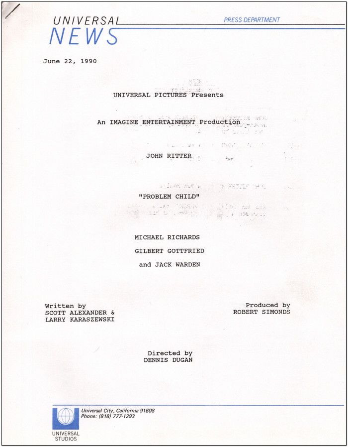 This is an original studio issued press kit from 1990. The press kit contains the following: a "PROBLEM CHILD" Cover Folder . . . 9 pages of Cast and Credit Information . . . 6 pages of Production Notes . . . 6 pages of info "About The Cast" . . . 3 pages of info "About The Filmmakers" . . . a 3-Page Biography on John Ritter . . . 5 Color Slides with a caption sheet explaining each slide . . . 9 Black and White Glossy Photos. The press kit is in NM condition. The cover folder, paperwork, slides and photos are in NM condition. The press kit has been stored in a dry, smoke free home. Nice item for JOHN RITTER fans and collectors.