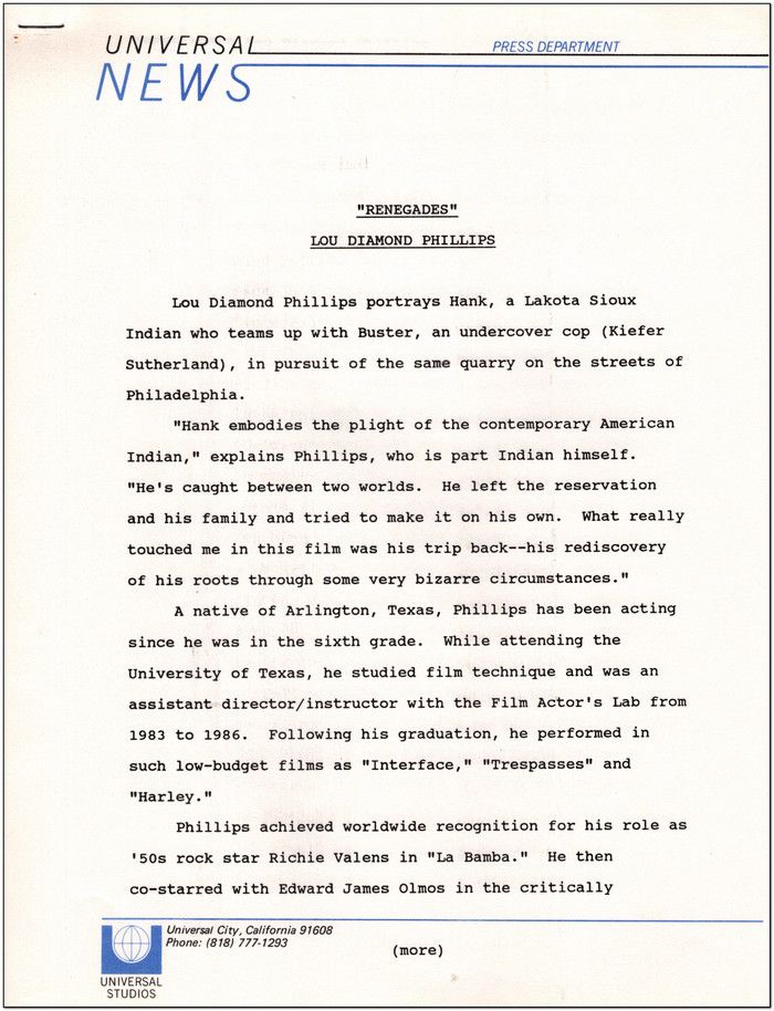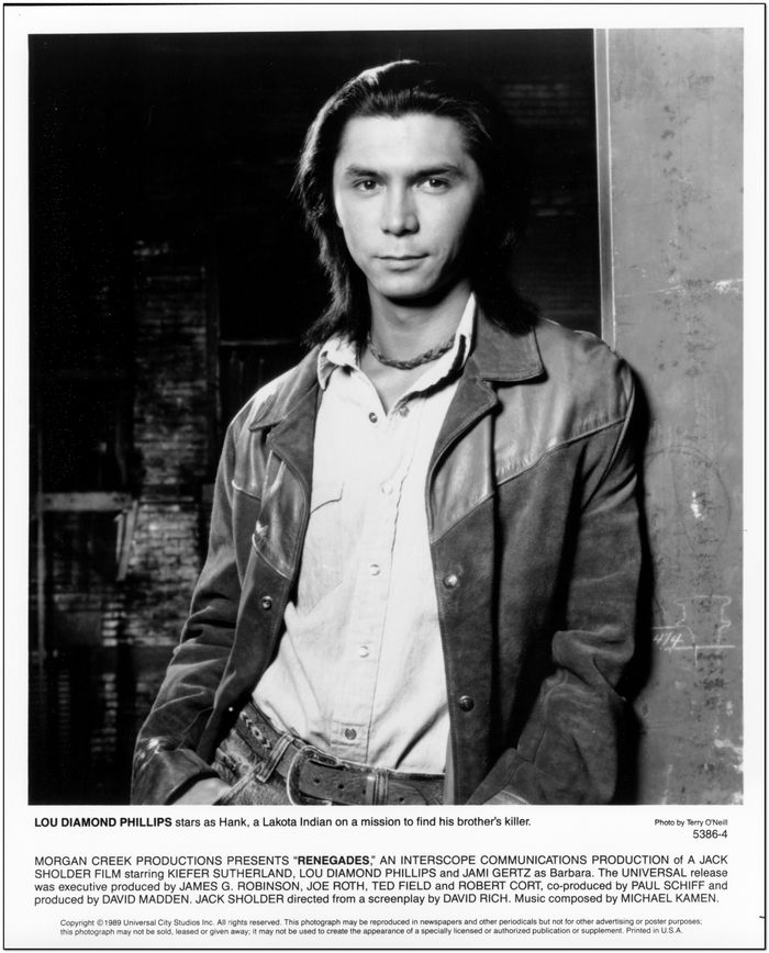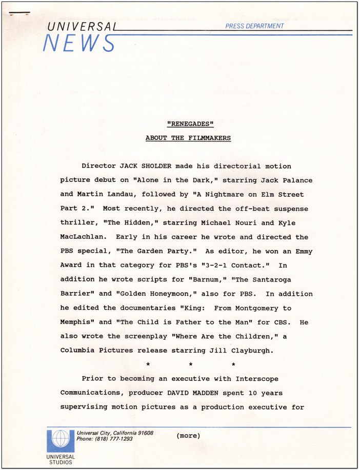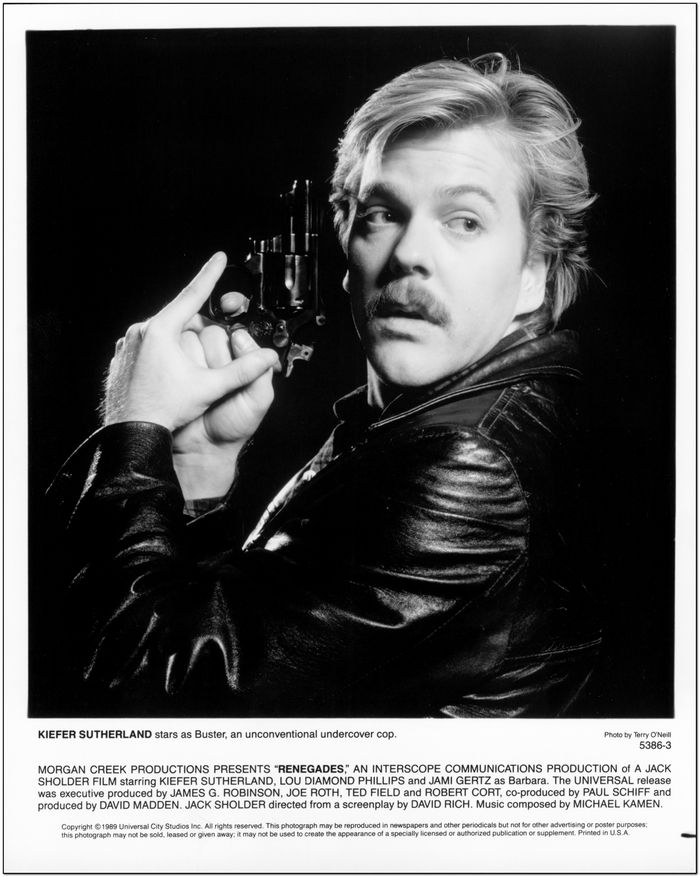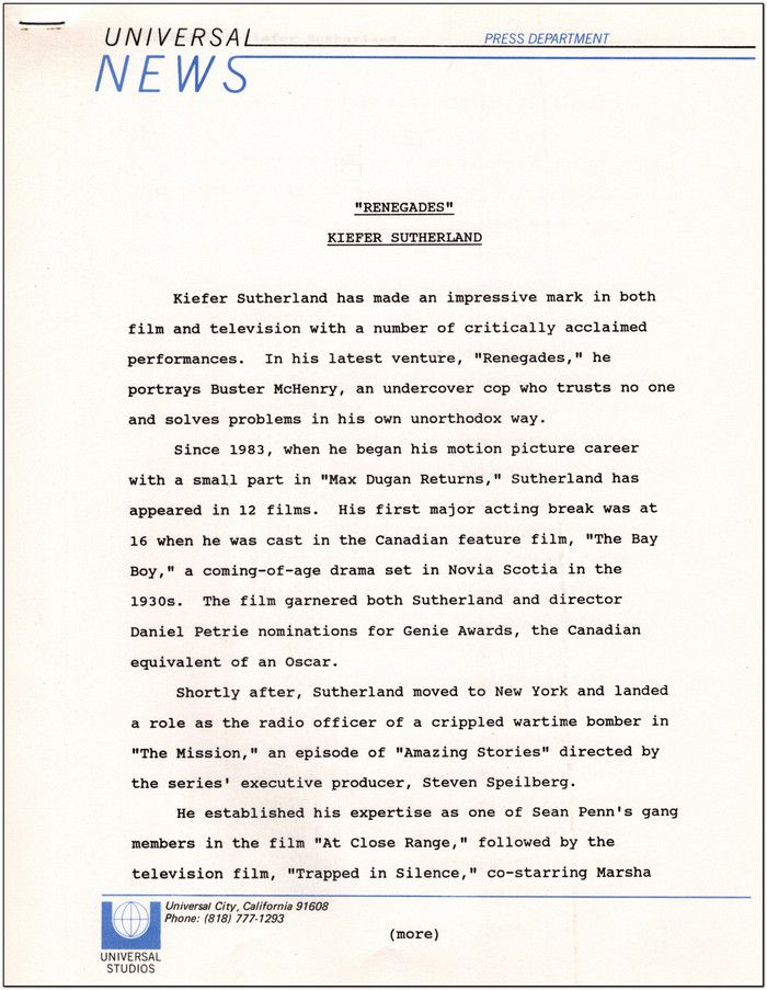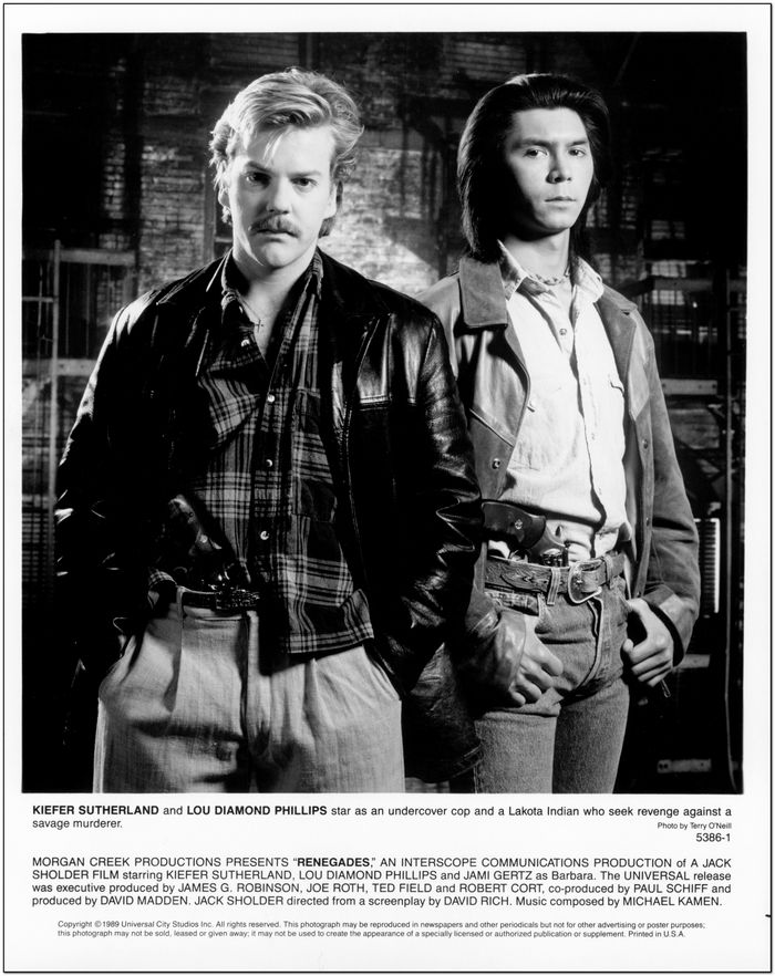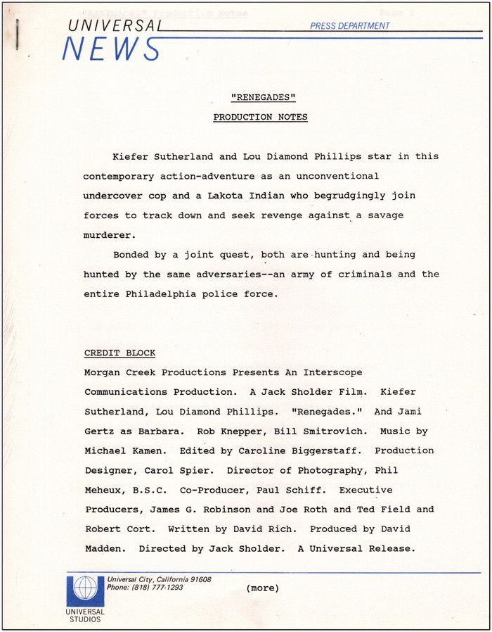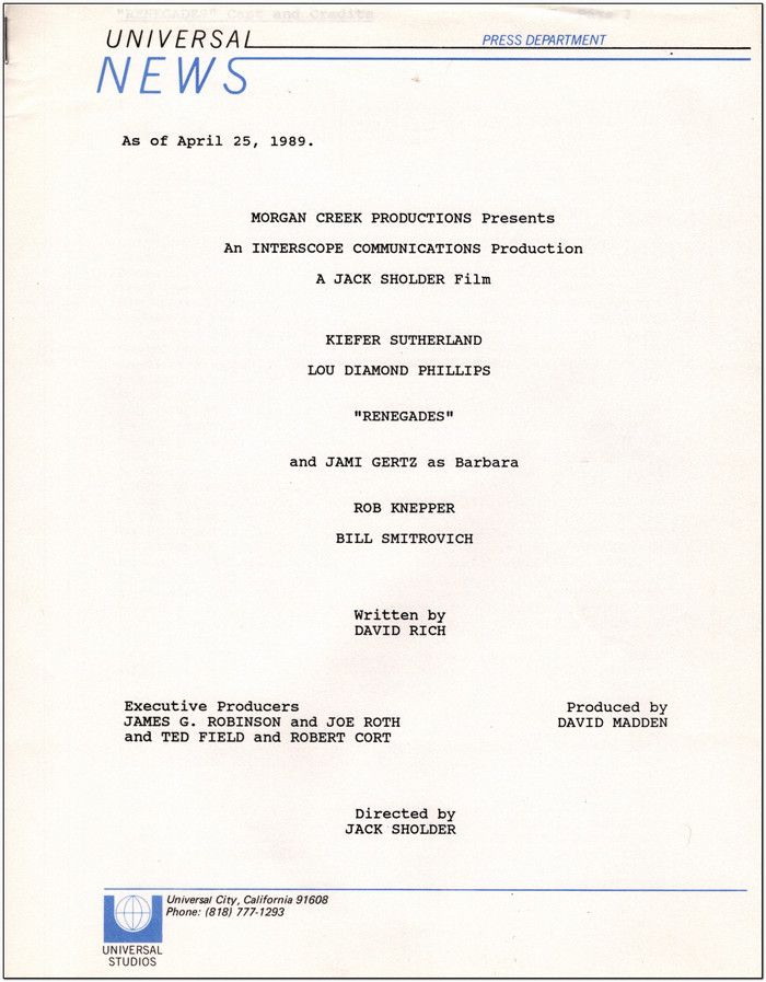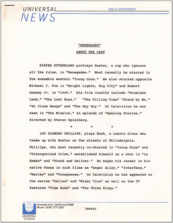 This is an original studio issued press kit from 1989. The press kit contains the following: a "RENEGADES" Cover Folder . . . 8 pages of Cast and Credit Information . . . 7 pages of Production Notes . . . 3 pages of info "About The Cast" . . . 4 pages of info "About The Filmmakers" . . . a 3-Page Biography on KIEFER SUTHERLAND . . . a 2-Page Biography on LOU DIAMOND PHILLIPS . . . 2 Color Slides . . . 5 Black and White Glossy Photos. The press kit is in NM condition. The cover folder is in VG condition. The paperwork, slides and photos are in NM condition. The press kit has been stored in a dry, smoke free home.