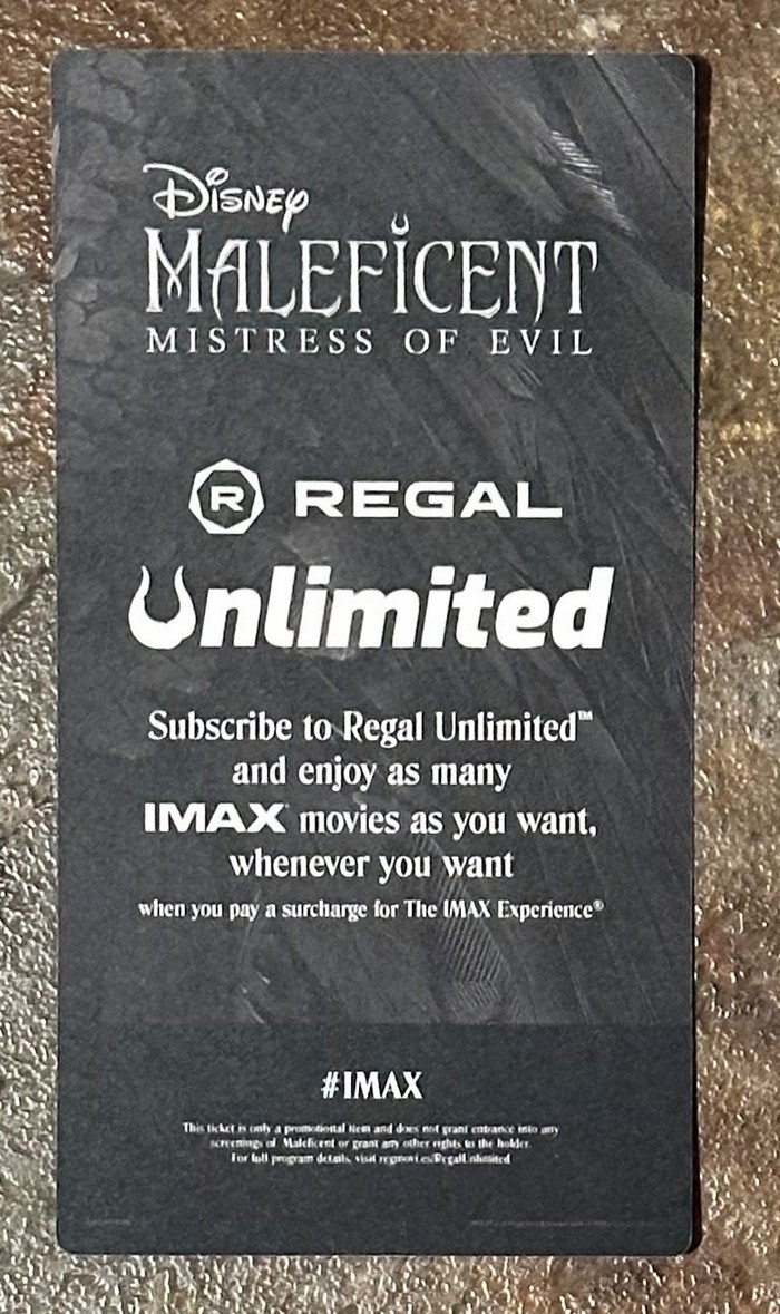 This is a Regal Collectible Ticket from the 2019 Disney movie - "Maleficent: Mistress Of Evil" - starring ANGELINA JOLIE. This souvenir collectible ticket is a limited-edition, physical movie ticket issued by Regal Cinemas. Unlike a standard paper or mobile ticket, it’s a premium, keepsake item made of thicker card stock featuring unique artwork tied to the film. The ticket features exclusive artwork not used on the regular movie poster. A cool and unique item for "MALEFICENT" fans!! (*** Please note: the photo I used shows ticket #2501 of 5000. Since I have a lot of these and sell a lot of these, the number on the ticket you receive may be different.)