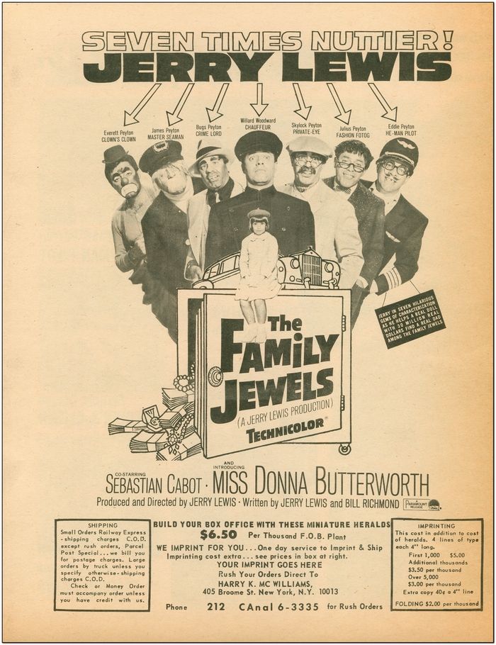 "MIRROR MIRROR ON THE WALL... WHICH ONE IS THE NUTTIEST JERRY OF ALL?" This is an original US Herald from the 1965 screwball comedy film - "FAMILY JEWELS" - starring JERRY LEWIS! This Herald has 4 pages and measures 8.75 x 11 inches in size. It's in Near Mint condition. It has never been folded. The Herald has a pale yellow tint to it and it was made that way - it hasn't faded over time. It has been stored in a dry, smoke-free home. A MUST-HAVE for JERRY LEWIS collectors!!